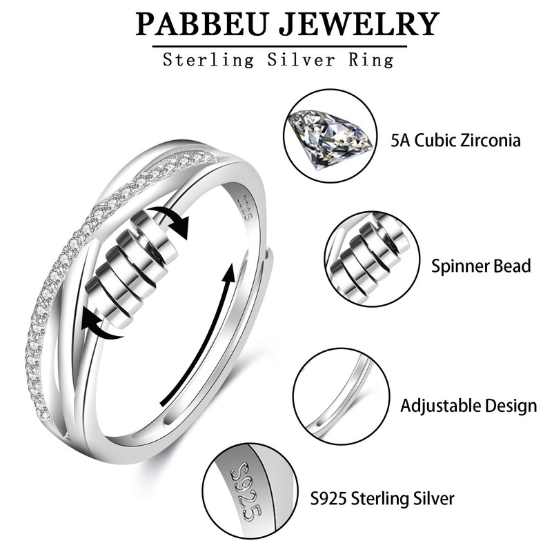 PABBEU Anxiety Ring for Women 925 Sterling Silver Fidget Ring With Cubic Zircon Adjustable Stress Spinner Anxiety Ring for Women