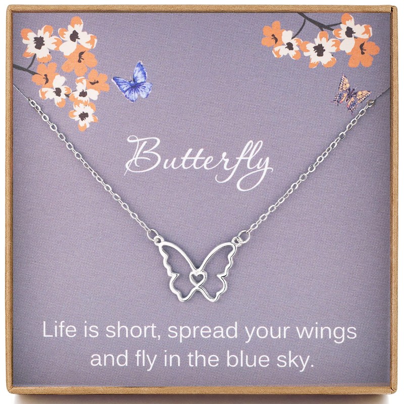 - Gift set: It includes a gift box, a silver polishing cloth, a blank greeting card, a gift bag, an envelope, and a soft pouch. The necklace is attached to a butterfly theme card. Finish writing the message card and take a minute to assemble.
