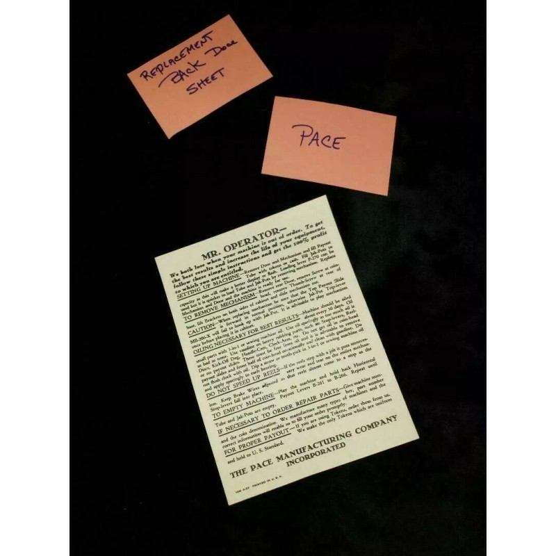 PACE REPRODUCTION PACE BACK DOOR INST SHEET ANTIQUE SLOT MACHINE