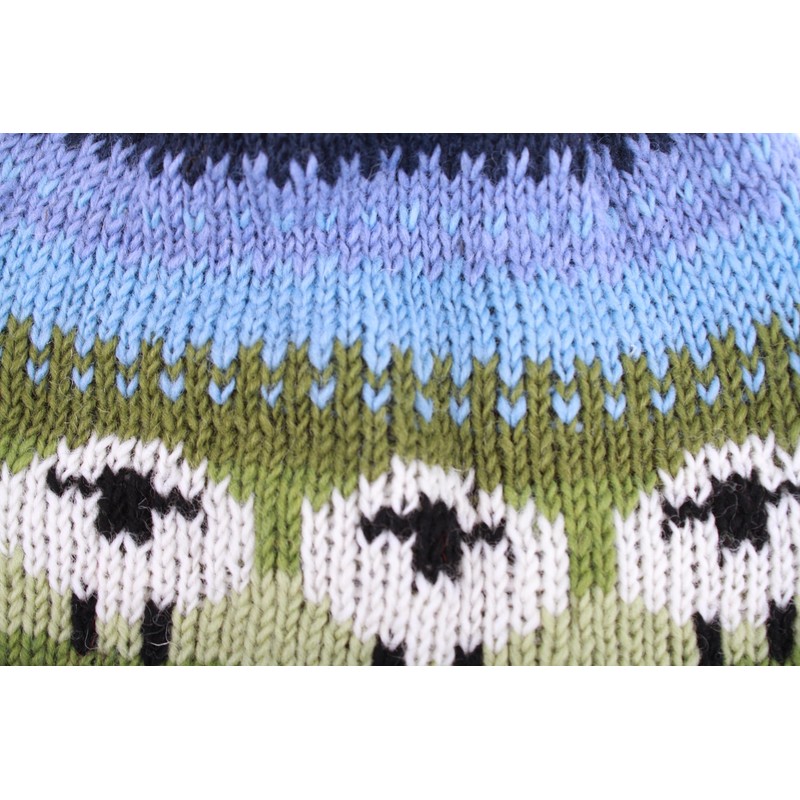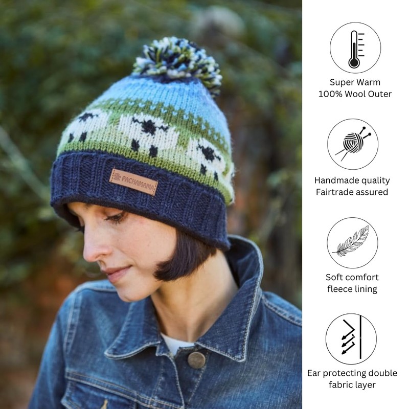 Pachamama Ladies Wool Bobble Hat Fleece Lined Rollback Hand Knitted Cute Sheep Design Blue Green One Size Handmade Extra Warm Fair Trade Blue Green One Size, blue / green