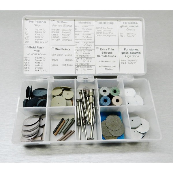 This is an Assortment Kit of Silicone based Polishing wheels, Mini Points, and more… made by Pacific Abrasives comes from Italy. The kit contains 70 Pieces with various mandrels. It is primarily designed and used in Jewelry Making, Creative Arts and Dental fields. Silicone polishers are also used by Metal-smiths, in the Gun-Knife Smithing, Clock& Watch repair, and instrument cleaning industries. Applications range from precious metals gold, silver and semi precious metals.