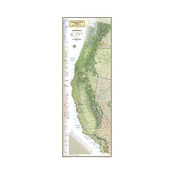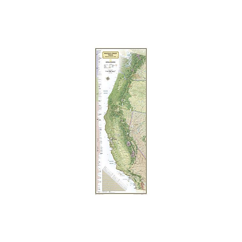 National Geographic's wall map of the Pacific Crest Trail is ideal for fans and hikers of this magnificent National Scenic Trail. This beautiful poster shows the entire length of the trail from Mexico to Canada through California, Oregon, and Washington. A unique elevation profile highlights the trail's peaks and valleys, and an informative mileage chart shows the distance between key locations. Also highlighted on this map are passes, peaks, national forests, national parks, state parks, and Indian reservations. Additional points of interest include lodges and campgrounds near the trail. All proceeds from the purchase of a National Geographic map help support the Society's vital exploration, conservation, scientific research, and education programs. "Map Scale = 1:1,700,000Sheet Size = 18" x 48""