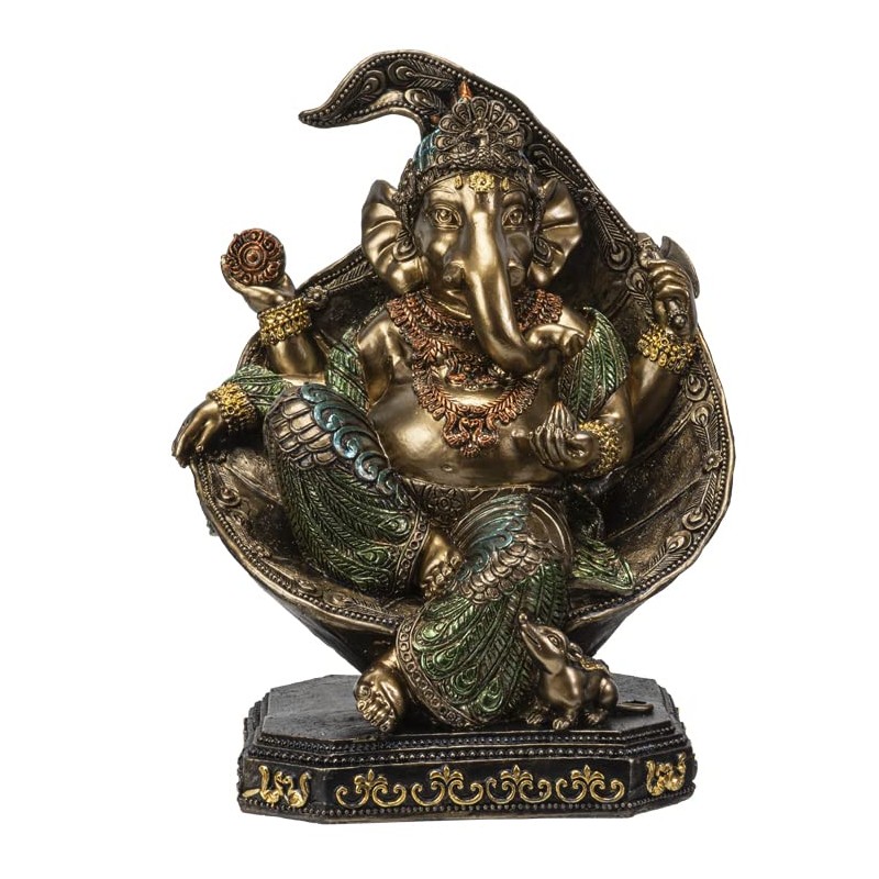 - Ganesha sits atop a richly decorated leaf that serves as his throne.