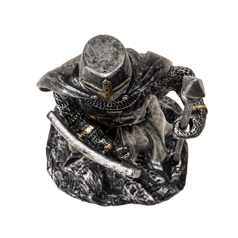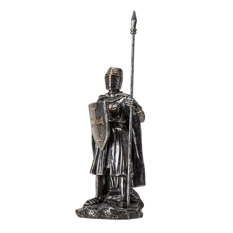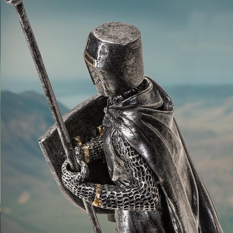 - [Detailed Craftsmanship]: Crafted from durable resin, this knight figurine features intricate details including a spear, shield with cross, chainmail, and helmet, making it a perfect representation of medieval armor.