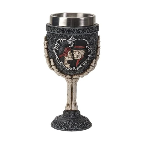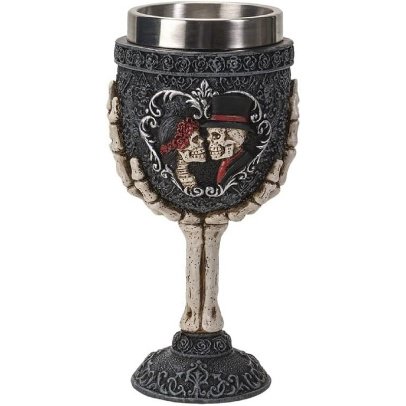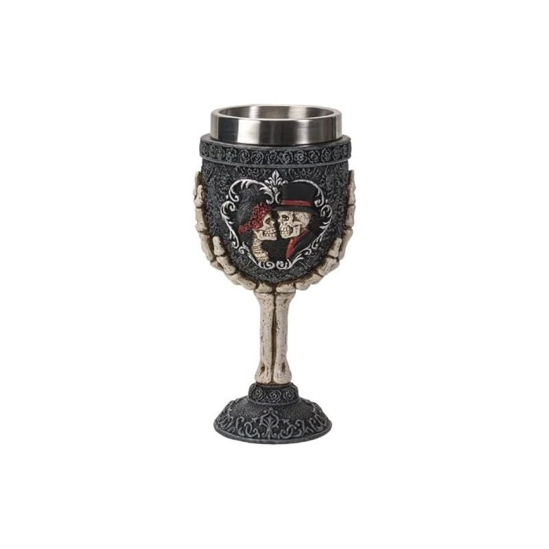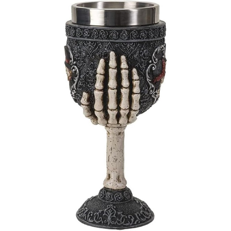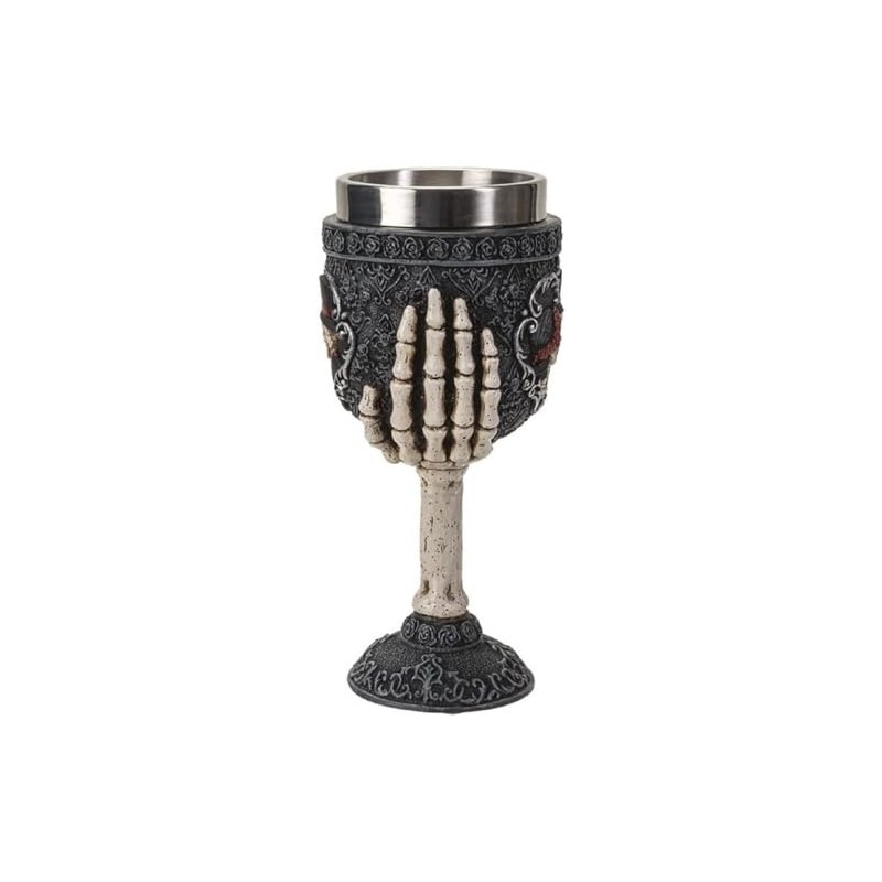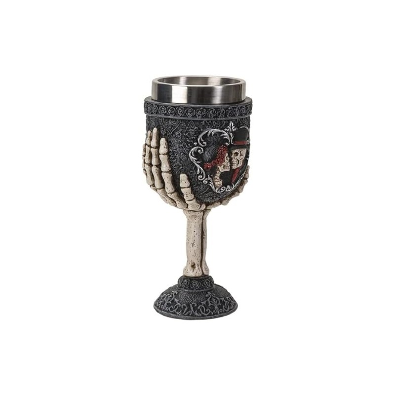 - Victorian Goth Goblet. |Skeletal Stem.|Stainless Steel Cup Insert.|Holds 7 Oz. |Lovingly Painted by Hand. |7" H x 3" W x 3" D. |100% Resin.