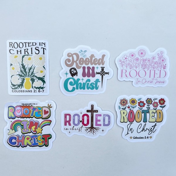 • DESIGN VARIETY: Set of 6 unique 'Rooted in Christ' sticker designs featuring different artistic styles, from floral to rainbow patterns, all inspired by Colossians 2:6-7