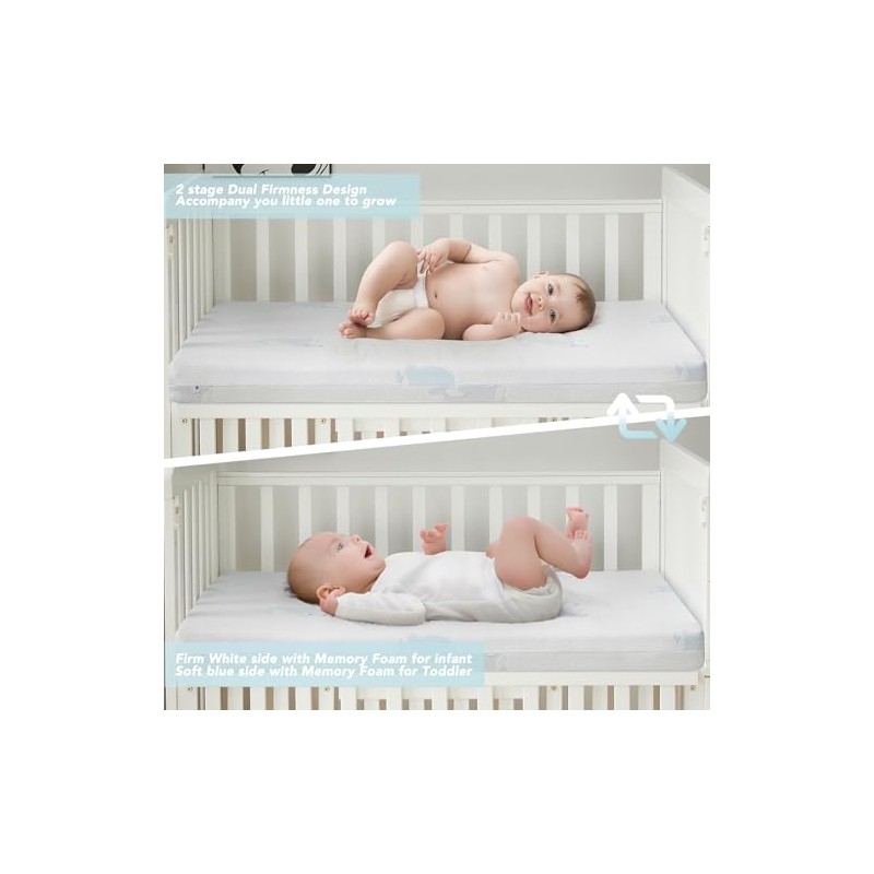 - Colchón de doble cara para bebés y niños pequeños: diseñado con dos niveles de firmeza, este colchón de cuna de doble firmeza cuenta con un lado de espuma de apoyo firme (lado blanco) para bebés (de 0 a 9 meses) y un lado de espuma viscoelástica de gel refrescante suave (lado azul) para niños pequeños (9 meses). Ideal tanto para dormir como para jugar.