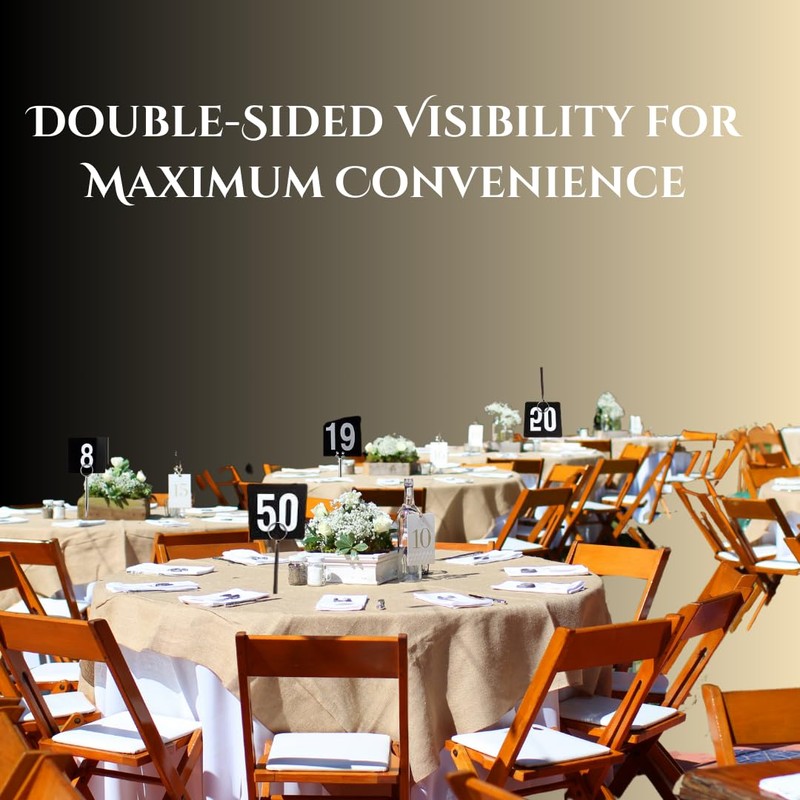 - Double-Sided Visibility for Maximum Convenience: Enhance your event's organization with our double-sided table numbers. The numbers are clearly visible from all directions, making it easier for guests and staff to locate tables without any confusion. This feature is especially beneficial in large venues or dimly lit environments where visibility can be challenging.