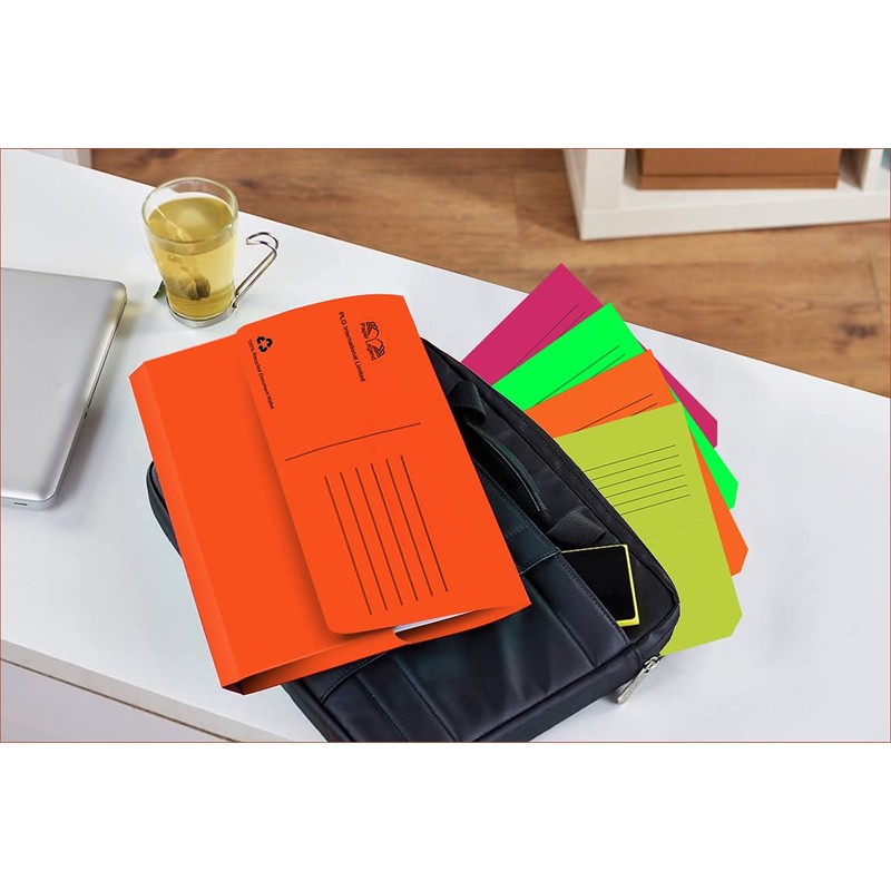 - High quality Coloured Foolscap Document Wallet. Each wallet is 34.5x24.5 cm in size, featuring 5 Assorted Fluorescent colours - Dark Green, Light Green, Dark Orange, Light Orange and Pink.