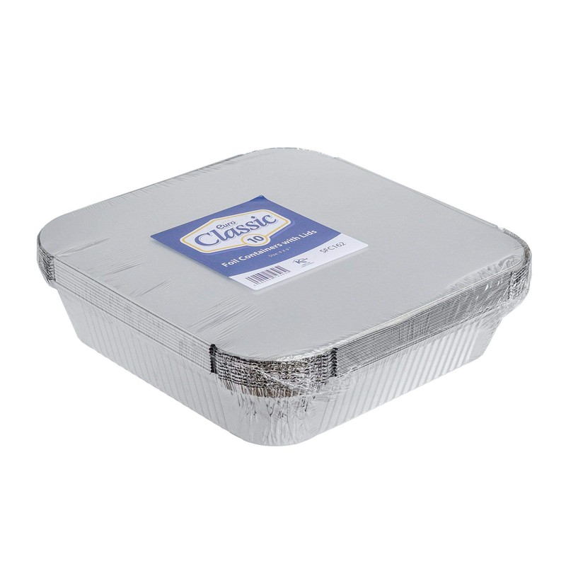 Pack of 10 Square Aluminum Container Pans with Lids ~ Foil Trays with Lids ~ Trays Good for Baking, Cooking, Storing and Freezing ~ 23cm x 23cm (9 inch x 9 inch)