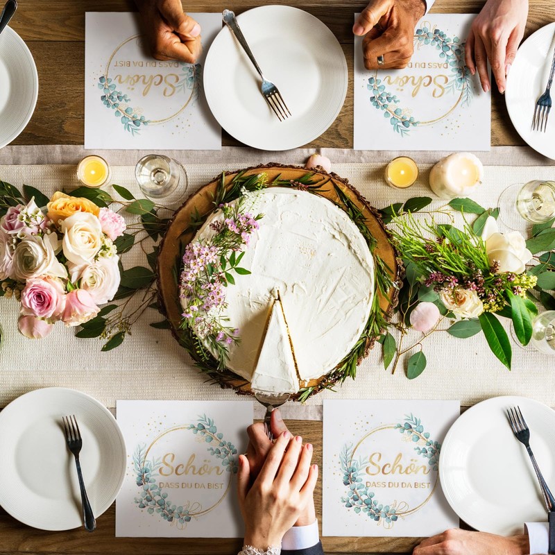 - Nice that we celebrate together: napkins with the writing "Schön, dass wir zusammen feiern", with champagne glasses and balloons is printed on each of our napkins for an eye-catching design that is perfect for adding a touch of "wow" to the table.
