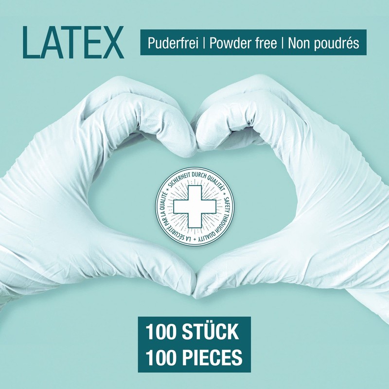 Features: latex disposable gloves in dispenser box, non-sterile, powder-free, 100 pieces/box, disposable gloves in six sizes (XS, S, M, L, XL, XXL)