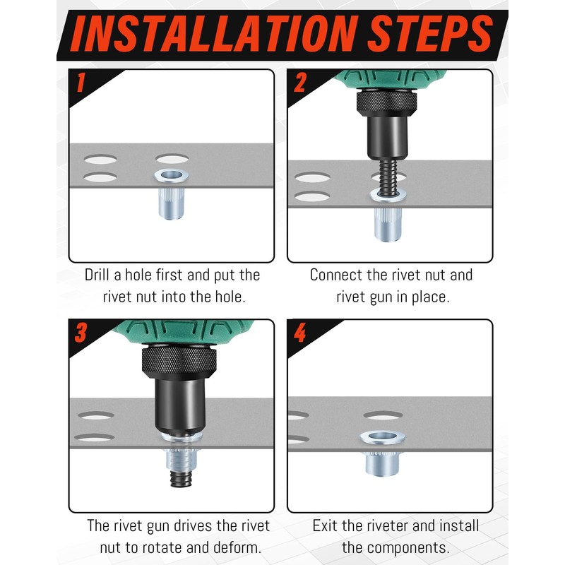 - Easy Installation Put the rivet nuts into the pre-installed hole, and then use the tool pressed the rivet nut sleeve for deformation and bulge, which plays a fixing role.