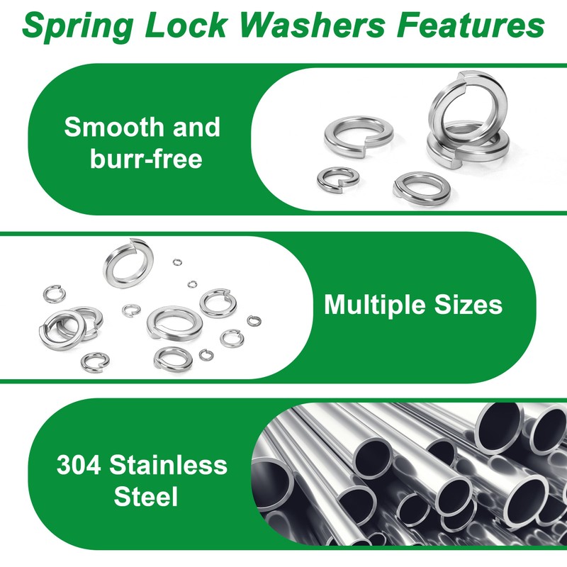 - Prevents loosening of screws - Spring washers become spiral free at one point and arc, which creates a greater rotating resistance and prevents screws and nuts from sliding, sliding or loosening due to vibration and torque.