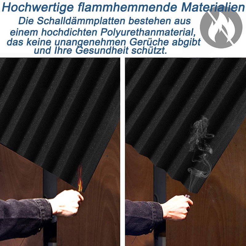 - High-quality flame retardant materials: the sound insulation panels are made of a high-density polyurethane material that does not emit unpleasant odours and protects your health. They are made from flame retardant and environmentally friendly materials and are safe for use in tight environments. The porous structure with high density dampens excess sound waves to create better recording effects.