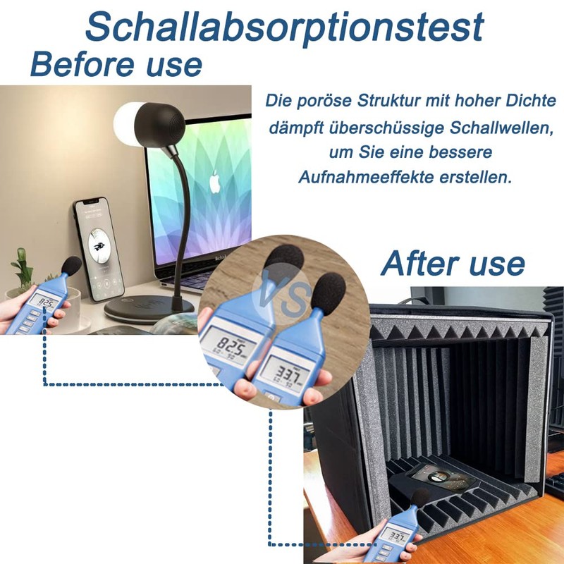 - High-quality flame retardant materials: the sound insulation panels are made of a high-density polyurethane material that does not emit unpleasant odours and protects your health. They are made from flame retardant and environmentally friendly materials and are safe for use in tight environments. The porous structure with high density dampens excess sound waves to create better recording effects.
