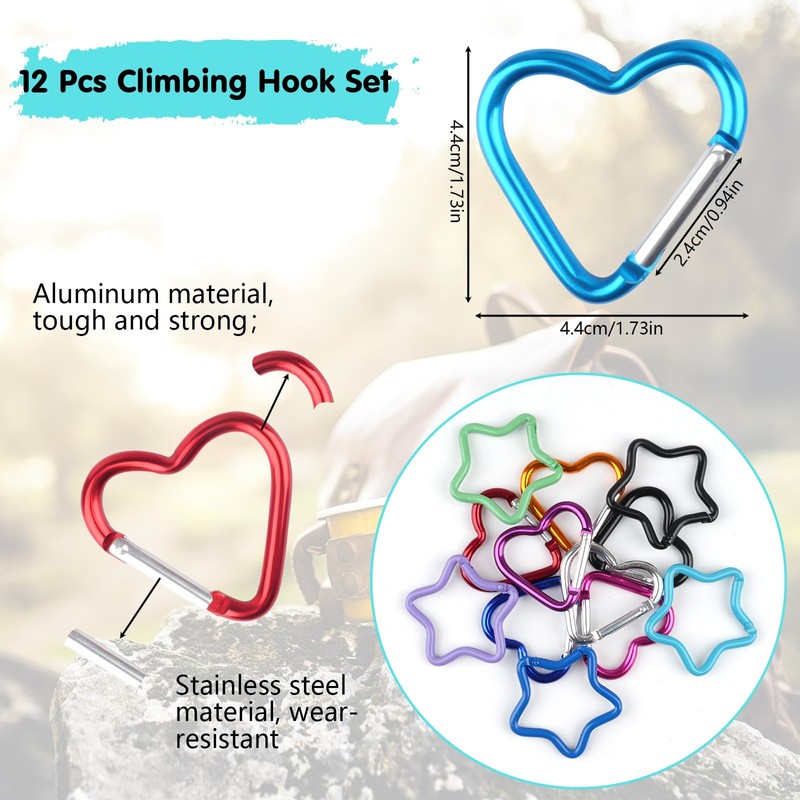- Carabiner set: carabiner set contains 12 carabiners, in heart and star, 44 x 42 mm in heart, 45 x 45 mm in star, and available in various colours. The vibrant colours add a colourful accent to your outdoor activities and meet different combination needs