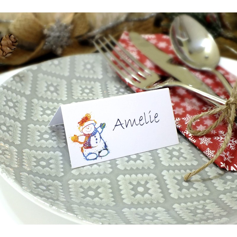 Pack of 12 high quality Christmas place cards in white, featuring three very colourful designs of Santa, Snowman and Christmas tree - perfect for your special Christmas dinner, party or event.