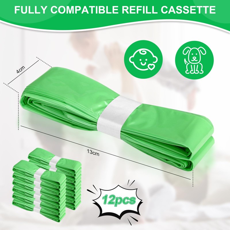 Pack of 12 Nappy Bin Refill Cassettes, 4.5 m, Tear-Resistant and Odour-Proof, Compatible with Tommee Tippee, Angelcare, LitterLocker, Sprout, Nappy Bin Refill Film for Cat Litter Disposal, Green