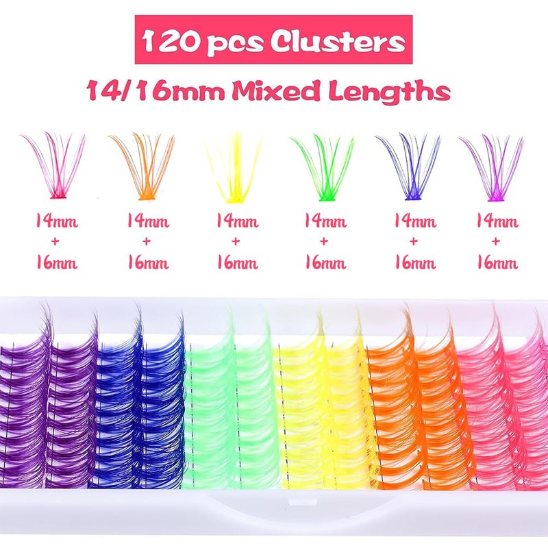 • COLOR LASH SET The 120 pieces colored eyelash extension set with 14+16mm length consists of 12 rows of 6 colors, including 2white, 2purple, 2green, 2blue, 2red, and 2 rows of pink, giving you more choice when choosing your makeup.