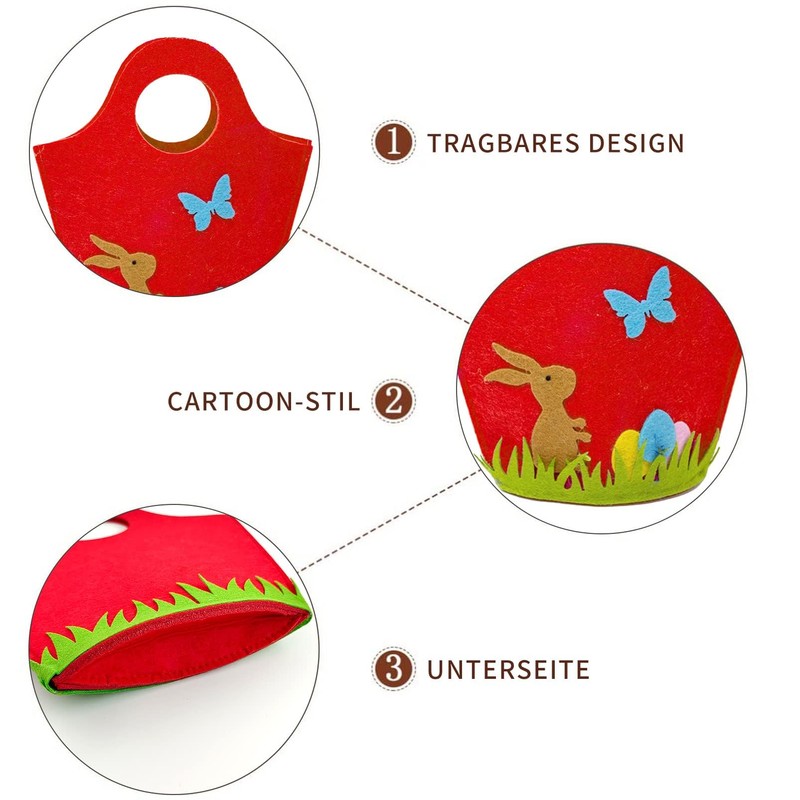 - You will receive: 3 Easter felt baskets + 10 temporary tattoo stickers for children. The size of the portable felt basket is 26 x 29 cm, and there are 3 colors: red, green, yellow.
