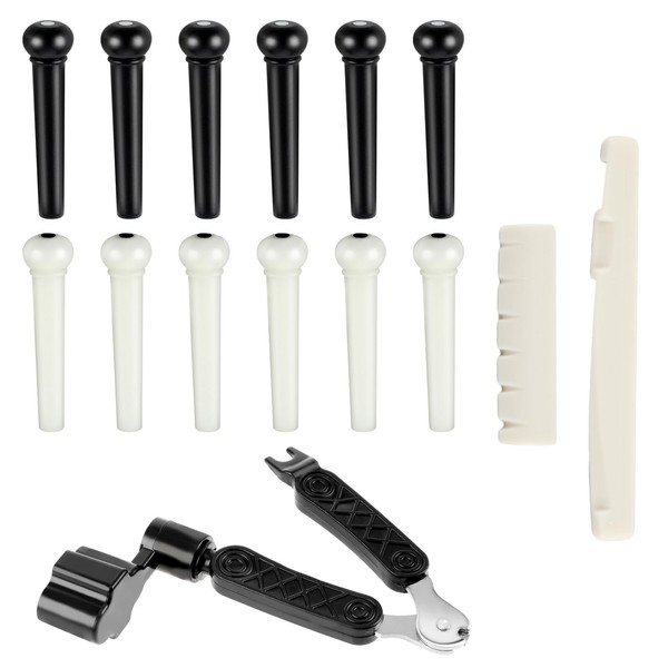 - COMPLETE REPAIR KIT This 15 piece acoustic guitar kit includes six ivory and six black bridge pins, a bridge saddle, a saddle and a 3 in 1 pin puller. This allows you to find all the important tools for quick repair and maintenance of your instrument.