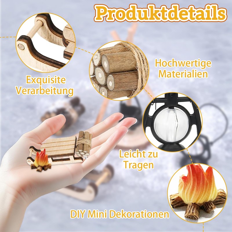 - Miniature Gnome Accessory Set: you will receive a complete 15 piece miniature dollhouse set, consisting of 1 sled, 2 bundles of firewood, 3 sticks, 1 hanging stove, 1 rope, 1 plastic campfire, 1 stake, 1 pair of boots, 1 carrying lamp, 1 miniature plastic axe and 1 bag of artificial snow.