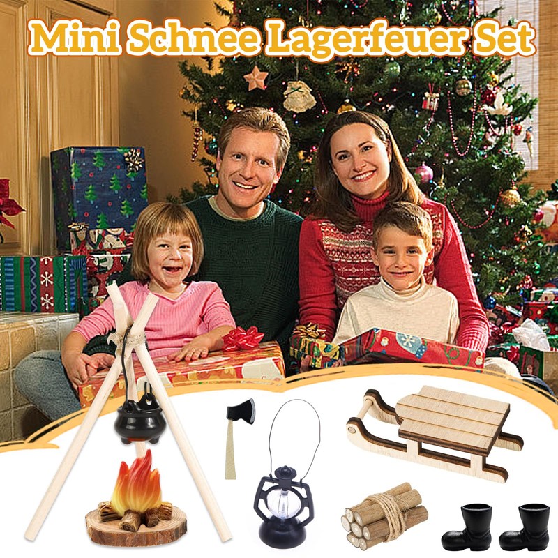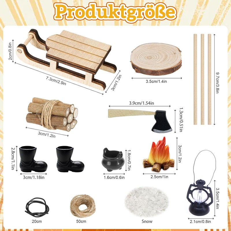 - Miniature Gnome Accessory Set: you will receive a complete 15 piece miniature dollhouse set, consisting of 1 sled, 2 bundles of firewood, 3 sticks, 1 hanging stove, 1 rope, 1 plastic campfire, 1 stake, 1 pair of boots, 1 carrying lamp, 1 miniature plastic axe and 1 bag of artificial snow.