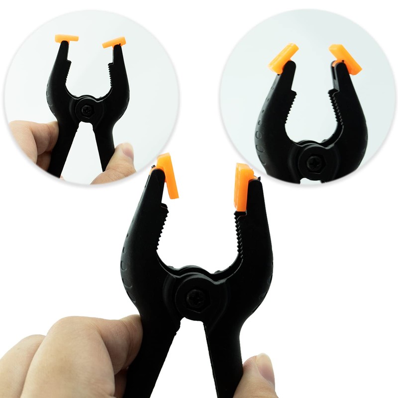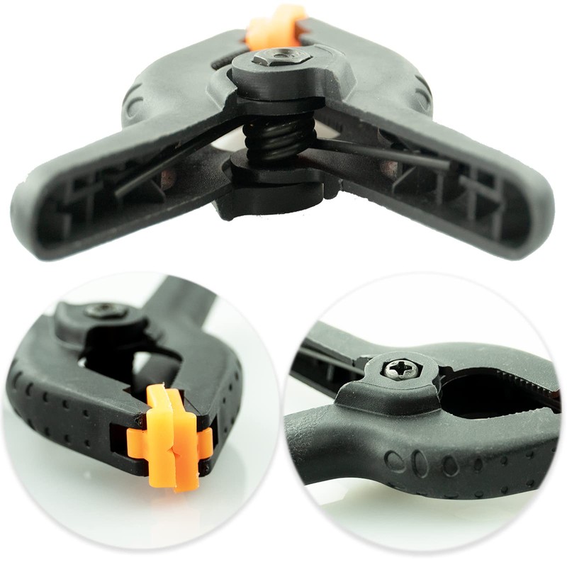 - Adjustable Jaw Plate The orange jaw plate on the top of the spring clip can prevent clip marks and damage. And that can be rotated 90 degrees, so you can adjust it as needed when you grab irregular items.
