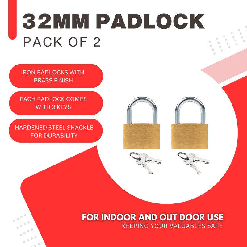 - 🔒🔑🔐🔓 TWIN PACK - Each pack includes two padlocks and six keys, offering convenience and flexibility for multiple locking applications. With a compact 32mm size, these padlocks are great for securing doors, gates, toolboxes, cabinets and even luggage during travel!