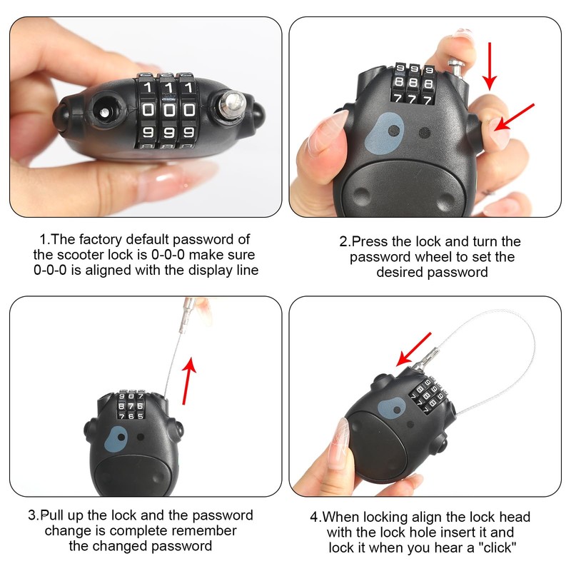1. The scooter lock initial password of the factory is 0-0-0. Make sure the 0-0-0 is aligned with the display line. Press the lock, hold it down and turn the password wheel to set the desired password. Pull the lock up and the password change is complete. Please remember the changed password. When locking, align the locking head with the locking hole, insert it and lock it when you hear a click.