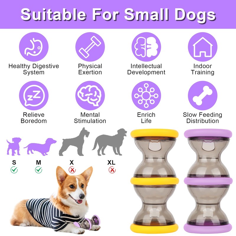 - Dog toy for more fun and interaction: especially the colours yellow and purple have been chosen, as they are particularly well perceived by dogs. These bright colours increase the attractiveness of the game and stimulate the dog to more interactivity. The small design (11 x 5.5 cm) is perfect for small dogs such as Pomeranian, Poodle, Corgis, Bichons or Chihuahuas, so that every dog can play easily and enjoy the joy of interactive dog toy.