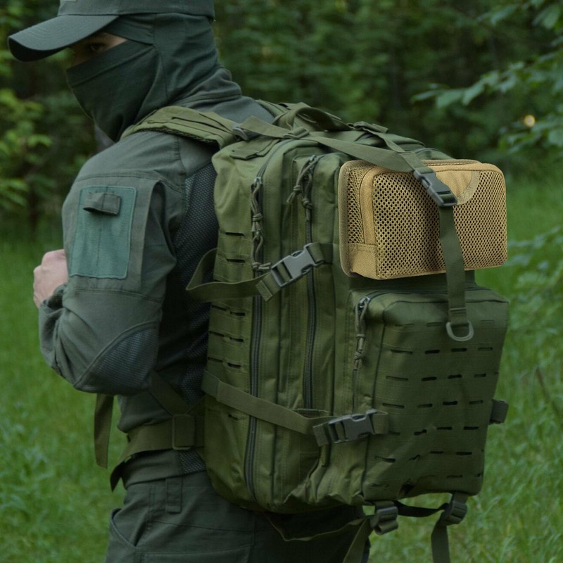 4. Three horizontal elastic loops securely attach tools such as flashlights, wrenches and pliers, preventing shake or bumping during transport. The remaining space allows flexible storage of various survival gear for the wilderness.