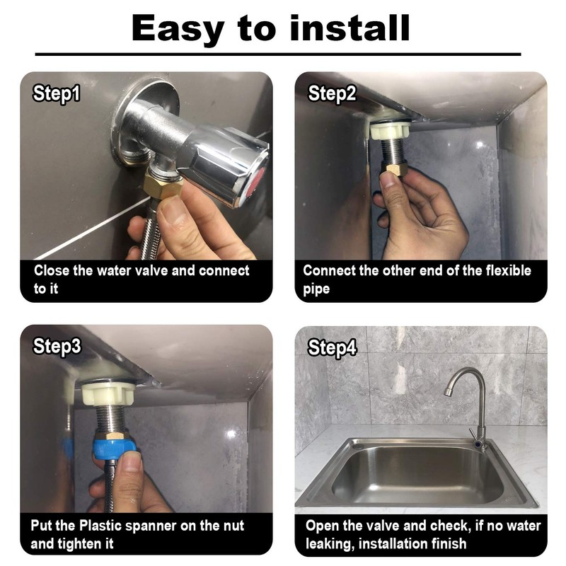 - The outer tube of faucet connector is braided by 304 stainless steel wire, No rust, corrosion resistant, stretch resistant, ensure long-term use.