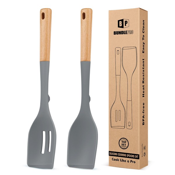 Pack of 2 Large Silicone Cooking Spoons, Heat Resistant Non Stick Kitchen Utensils with Wooden Handle, Ideal for Mixing, Stirring, Serving, Cooking(GRAY)