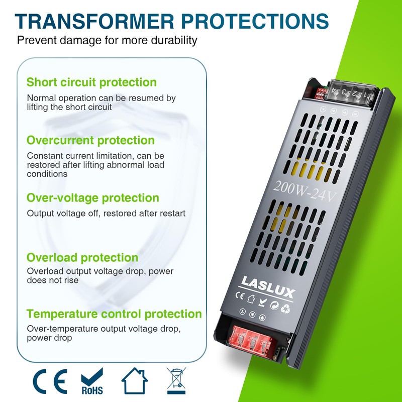 - Upgrade dimmable design: LASLUX 24 V LED transformer supports four precise dimming levels (25%/50%/75%/100%) and has a soft start function. When switched on, the LED strip gradually becomes brighter, which allows the eyes to gently get used to the light and create a pleasant lighting experience without glare.