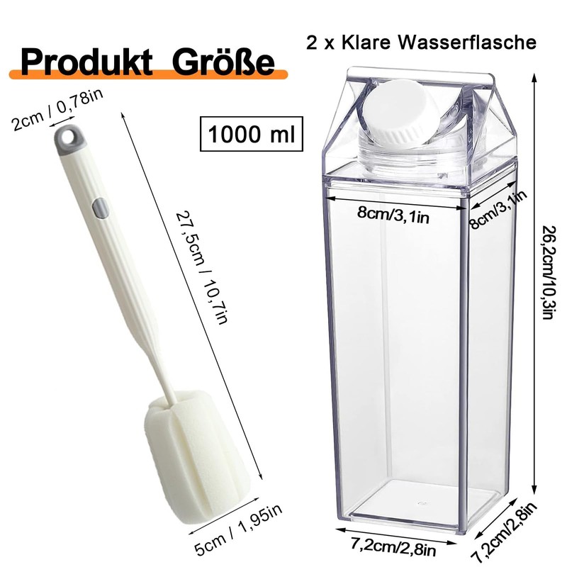 Pack of 2 Milk Carton Water Bottle, 1000 ml Transparent Milk Carton, High Capacity Clear Water Bottle, Reusable Square Milk Bottle, Juice Container Bottle with Brush, for Camping