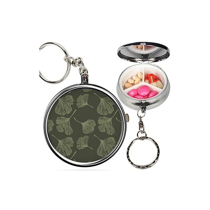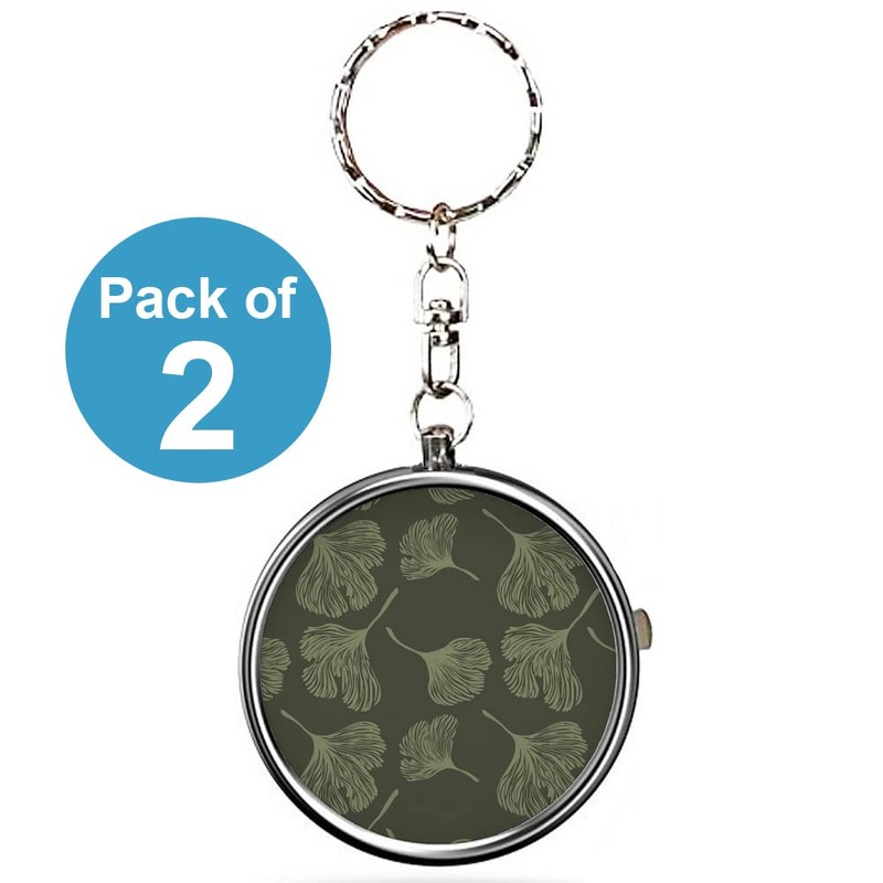 Pack of 2 - Portable Pill Organizer (Gingko Leaves) Metal Medicine Box, 3 Compartment Stash Vitamin Meds Case with Keychain