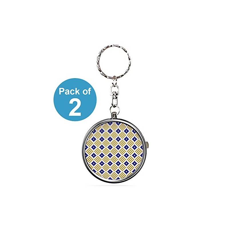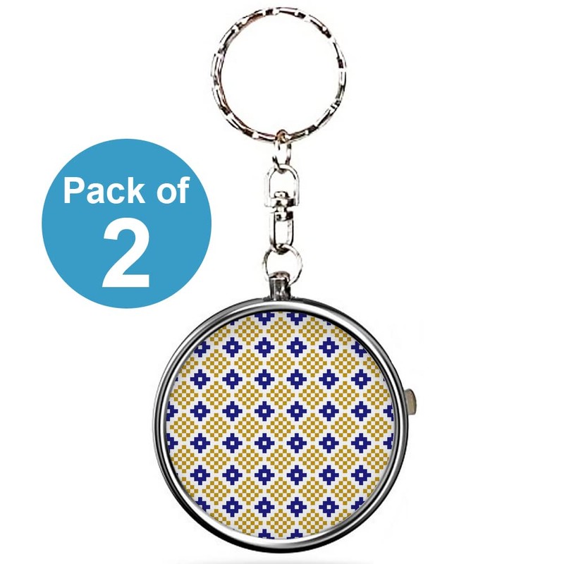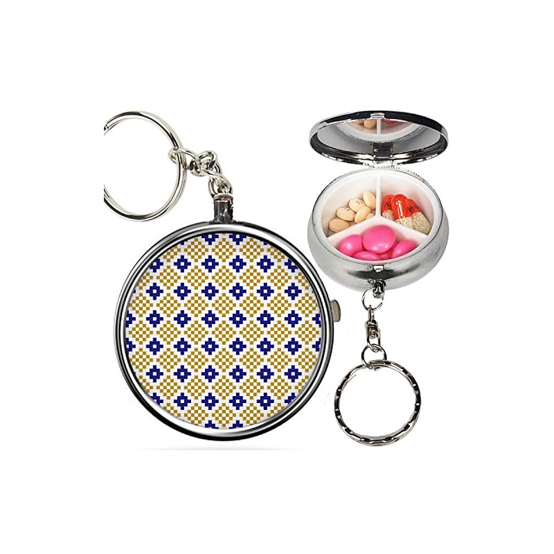 Pack of 2 - Portable Pill Organizer (Traditional Ethnic Cross Stitch Square) Metal Medicine Box, 3 Compartment Stash Vitamin Meds Case with Keychain