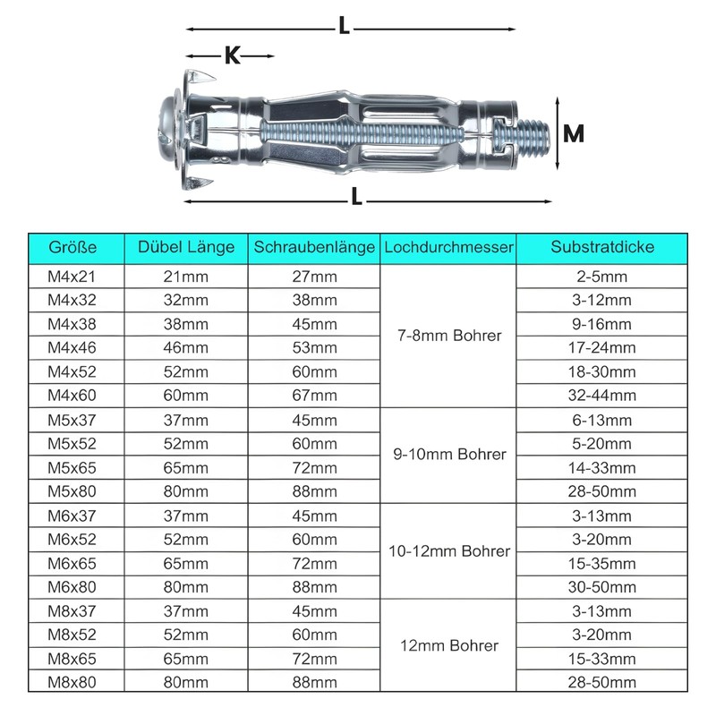 - Easy to use: simply pre-drill with suitable drill, hammer in the dowel and screw in the screw, everything is firmly attached. The dowel set is ideal for quick installation of plasterboard dowels metal or drywall dowels, whether on walls or ceilings