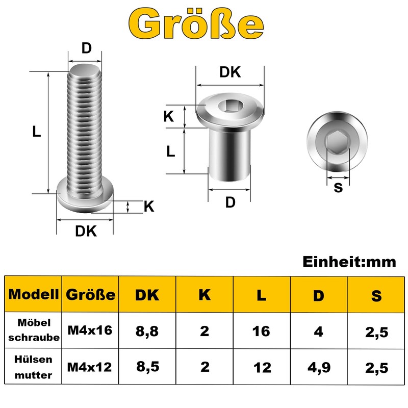 - Package Includes The package includes 20 pieces M4 x 16mm sleeve screws, 20 pieces M4 x 12mm sleeve nut and an Allen key. The screws are reusable and sufficient for daily use