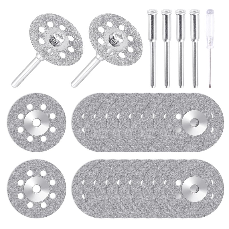- Diamond cutting disc set: 20 x diamond cutting disc diameter: 22 mm; thickness: 0.6 mm; 4 x mandrel diameter: 3.0 mm; 1 x screwdriver: 98 mm