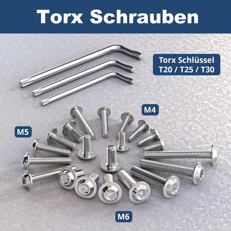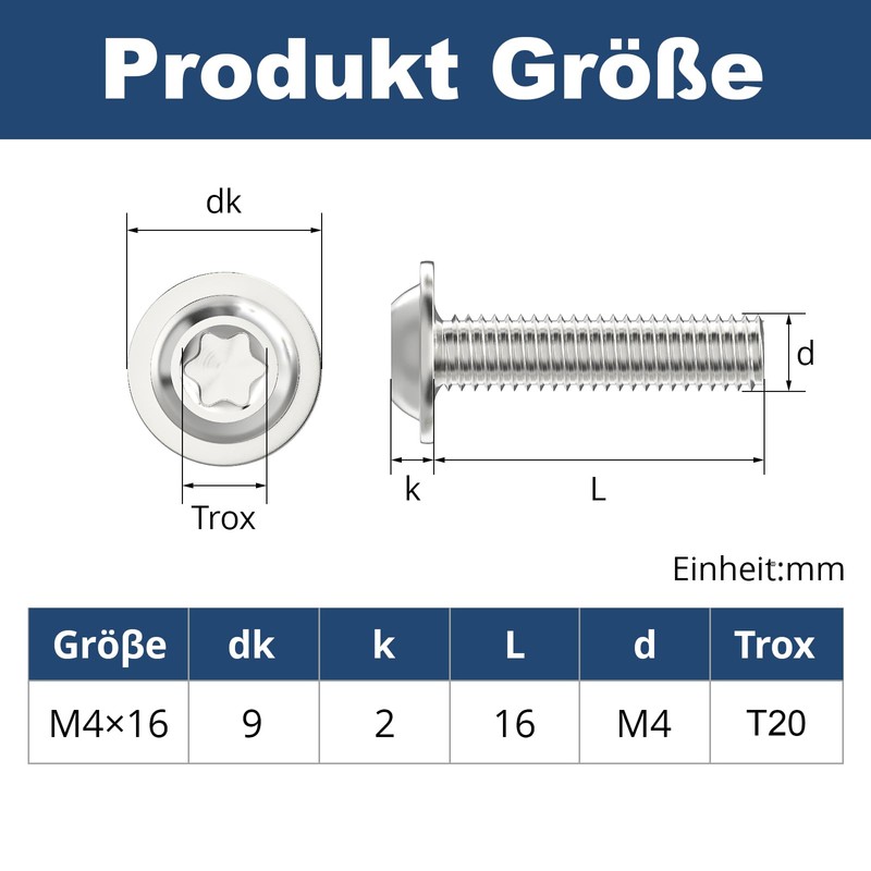 - Product parameters: Torx pan head screws, with Torx key. Size: M4 x 16 mm; Quantity: 20 pieces; Material: stainless steel A2 V2A; head type: Torx lens head; drive: Torx key T20