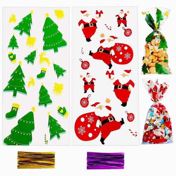 Pack of 200 Christmas Cellophane Bags, Christmas Cello Treat Bags, Goodies Bags, Gift Bags with 200 Pieces Twist Ties for Christmas Party Supplies (A)