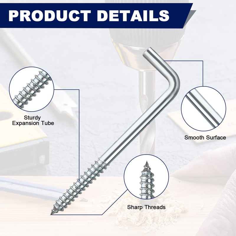 - Wide application: L-shaped screw hook can be used in all areas, e.g. in home decoration, furniture assembly and mechanical engineering. Our screw hook is also suitable for technical scenarios such as outdoor fences, billboards and display stands.
