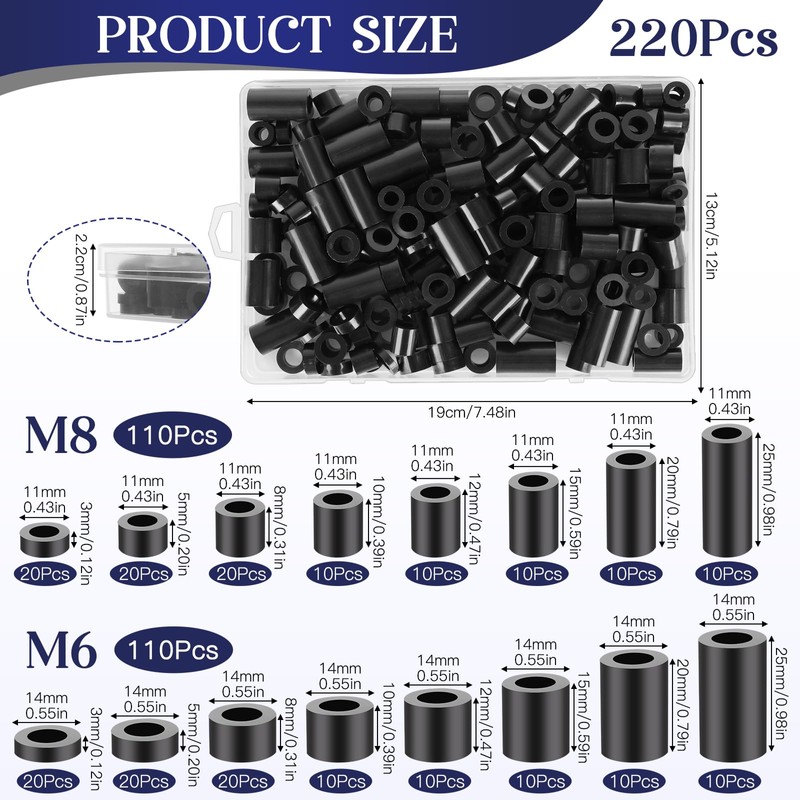 Pack of 220 Round Spacers Kit, 110 Pieces Spacer Sleeves M8 110 Pieces Spacer Sleeves M6, Spacers with Storage Box, Black Spacer Sleeves Nylon Washers Insulation Washers