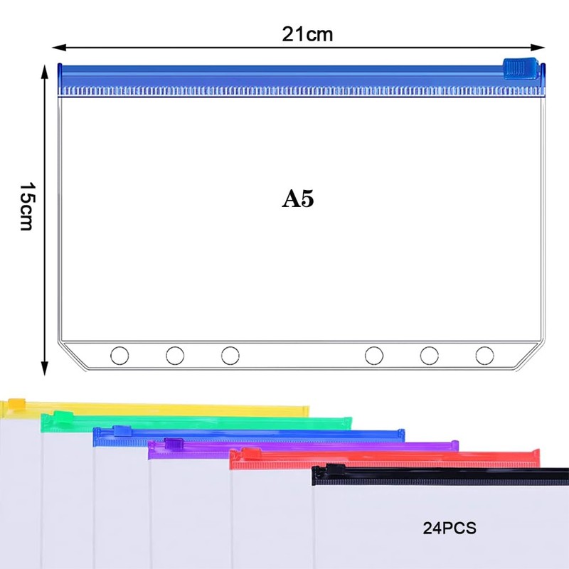 • Package includes: contains 24 pieces A5 6-hole transparent folder bags, 7 colours zip pockets, 4 pieces per colour. Suitable for office, study and daily use.
