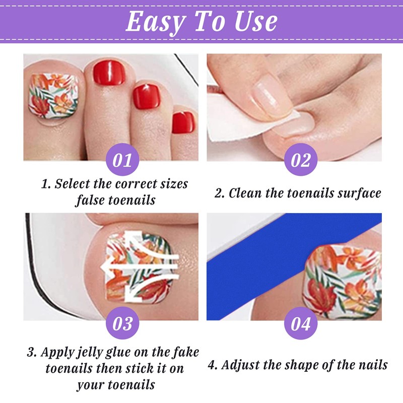- Easy to use: choose artificial toenail tips in the right size, stick jelly glue and press for 15 seconds. In just 5 minutes, you can achieve the same glitter effect instead of paying half an hour for the expensive manicure in the nail salon. Finally, file and shape your new nails if necessary, your nails could be more natural and chic.