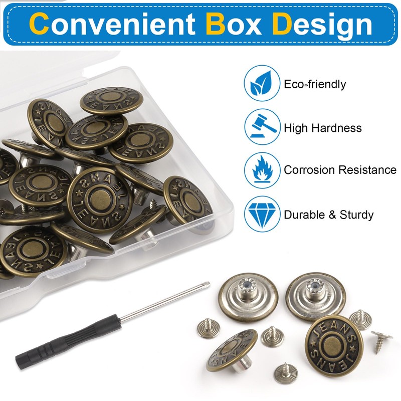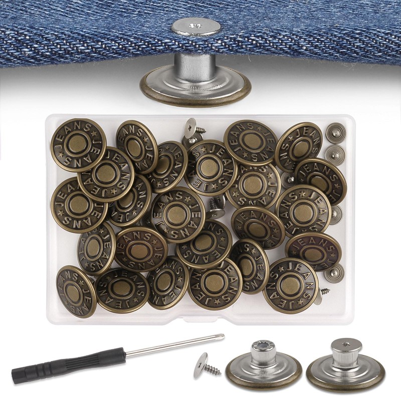 - Pack of 24 trousers replacement buttons: the set contains 24 adjustable jeans buttons, 20 mm diameter. And 1 piece screwdriver, packaged. It can meet different needs in your life and match different clothes.