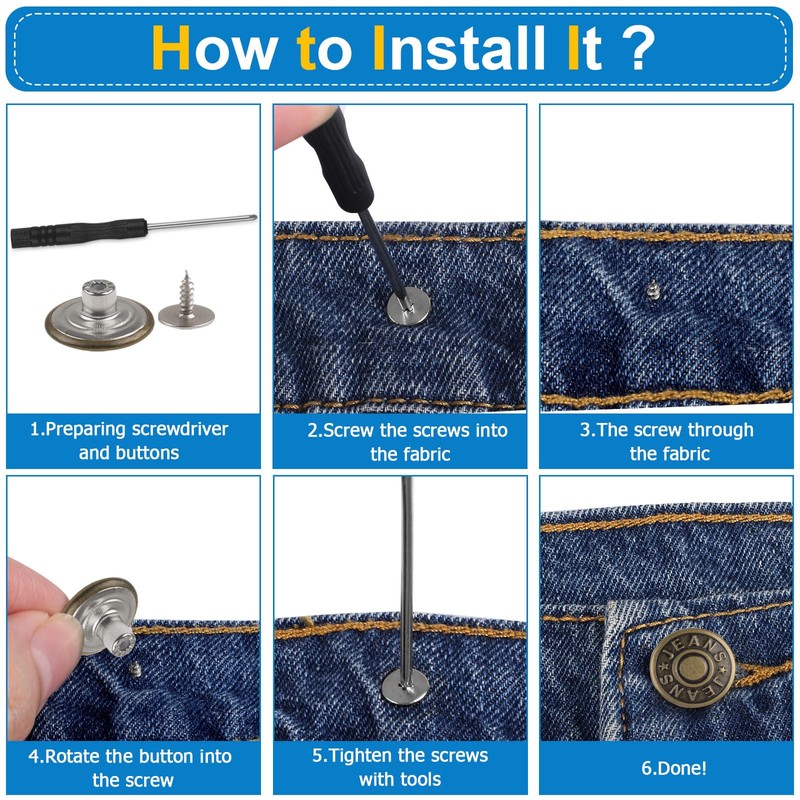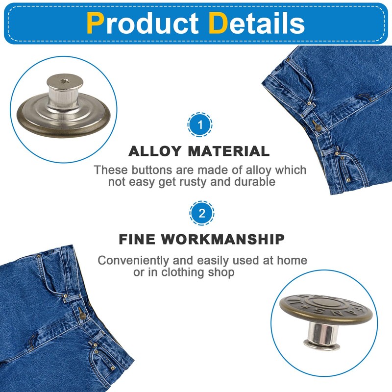 - Perfect fit every time: you have bought trousers that do not fit you well or that are too large after losing weight, but do not want to buy a new one? The DIY jeans button can easily help you solve these problems. You don't have to buy new trousers. Simply use these buttons to improve the fit of your pants.